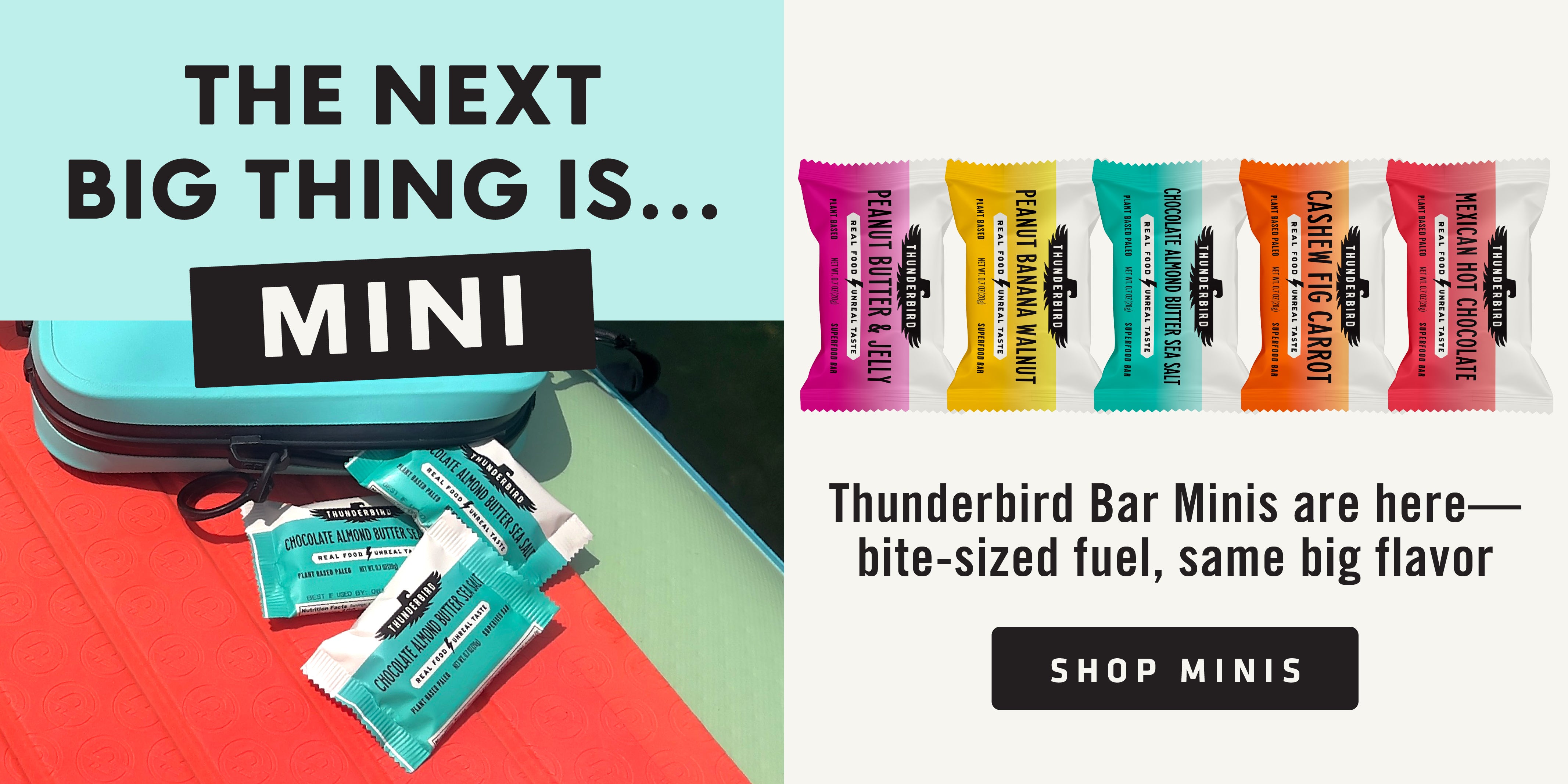 Now available! Our mini Thunderbird Bars deliver the same bold flavor and energy boost you love, now in a perfectly portable size. Each bite-sized bar packs the signature Thunderbird punch of premium ingredients and natural energy!