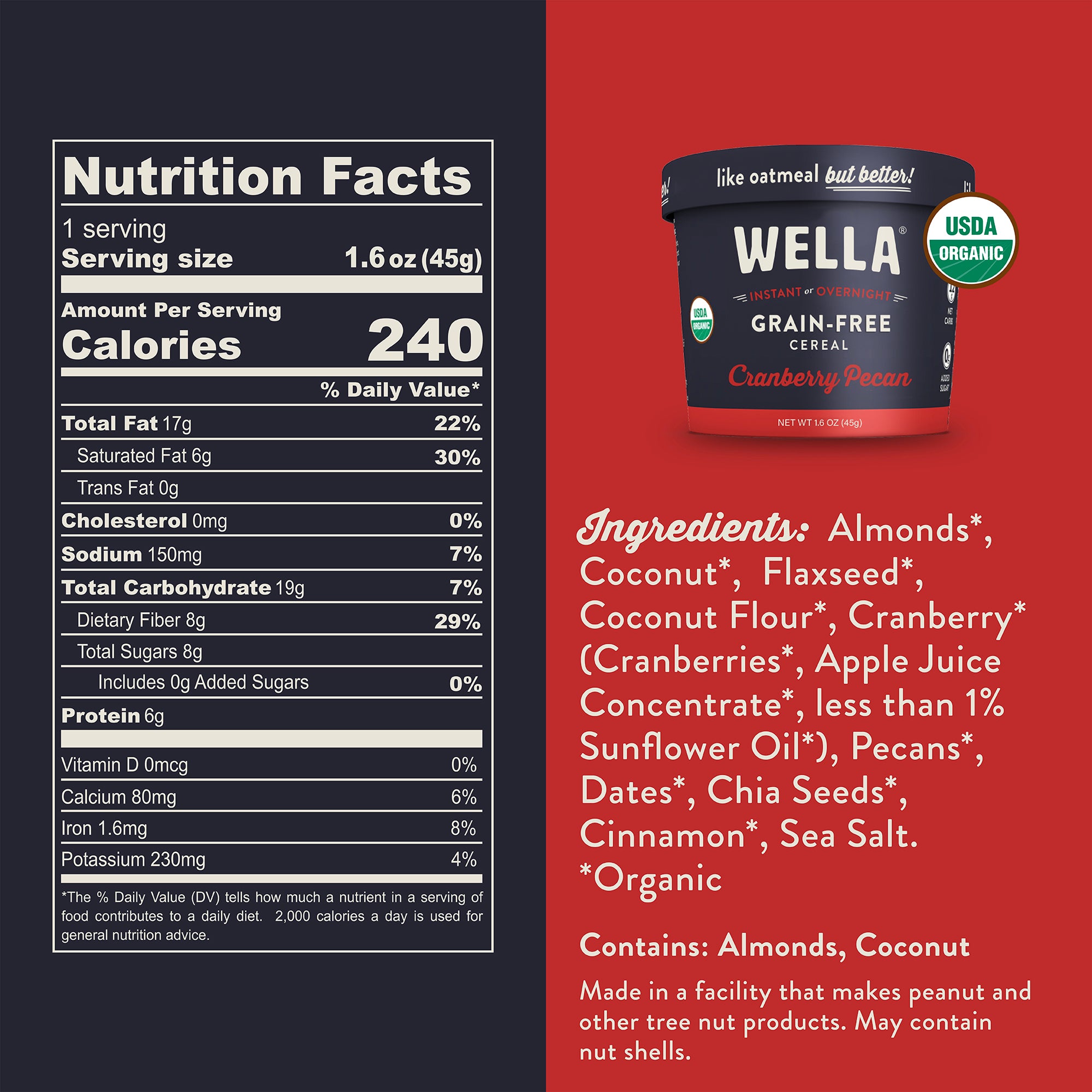 Reimagine breakfast with this nourishing and intensely satisfying grain-free, paleo alternative to oatmeal. With 2x the protein and 3x the fiber of oatmeal, and only 11 net carbs and less than 250 calories, Grain-Free Cereal is the perfect grab n' go breakfast or anytime of day snack. Sweet & Savory - tart cranberries pair perfectly with nutty pecans for a sweet meets savory delight.