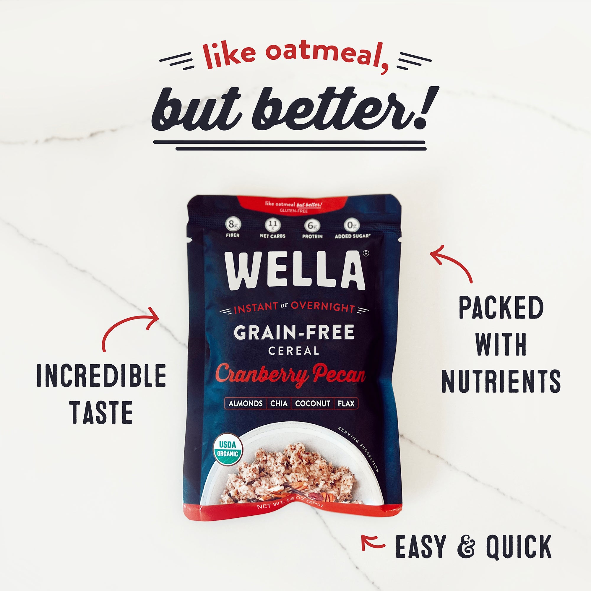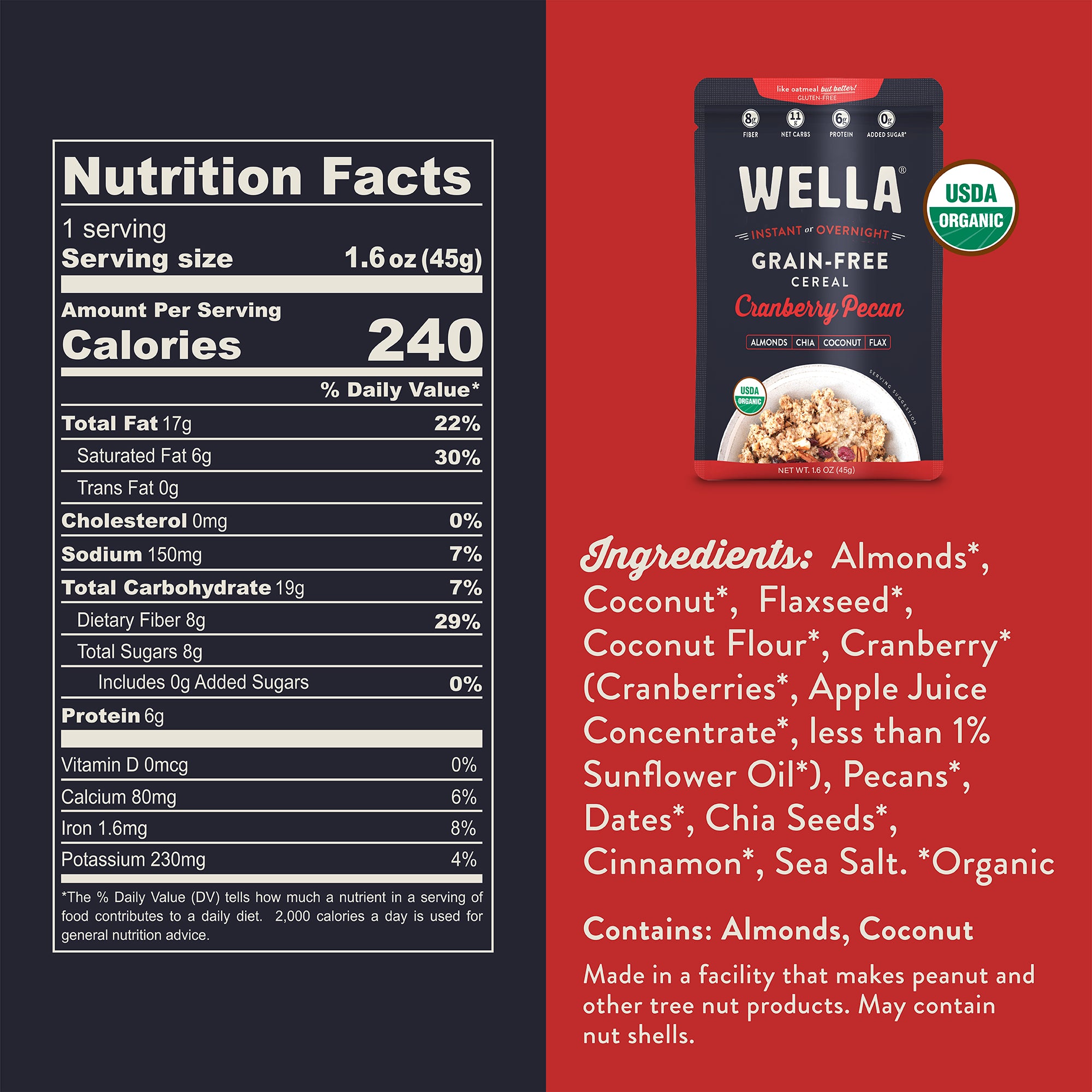 Reimagine breakfast with this nourishing and intensely satisfying grain-free, paleo alternative to oatmeal. With 2x the protein and 3x the fiber of oatmeal, and only 11 net carbs and less than 250 calories, Grain-Free Cereal is the perfect grab n' go breakfast or anytime of day snack. Sweet & Savory - tart cranberries pair perfectly with nutty pecans for a sweet meets savory delight.