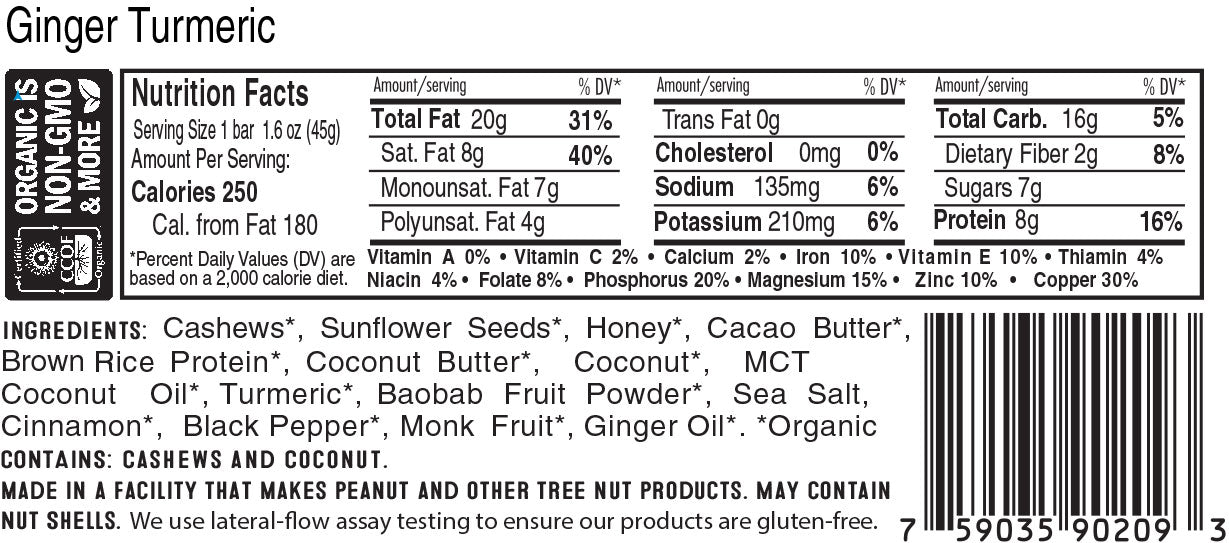 Our creamy blend of house-made cashew butter, lightly sweetened with honey and a touch of monk fruit provides the perfect base for this turmeric* ginger powerhouse. We add a pinch of black pepper to enhance turmeric absorption, with brown rice protein to boost the staying power of this plant-based superfood snack.